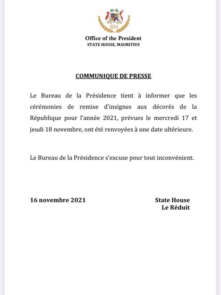 وفقا بيان صحفي من مكتب رئيس جمهورية موريشيوس صادر في يوم الثلاثاء 16 نوفمبر 2021م، لا يكون رئيس الجمهورية سعادة السيد بريثفيراج سينغ روبون قادرًا على أداء مهام منصبه لمدة قصيرة و وفق المادة 28 (7) من الدستور سعادة السيد ماري سيريل إيدي بواسيزون، نائب رئيس الجمهورية يتولى مهام مكتب الرئيس أثناء غياب سعادة السيد بريثفيراجسينغ روبون