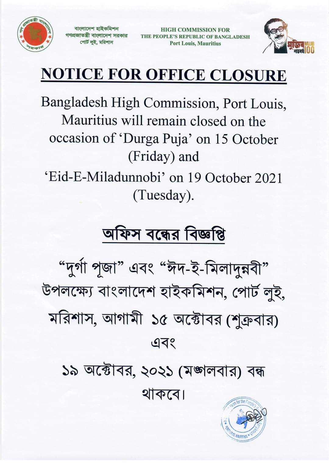 سيظل مكتب المفوضية العليا لبنغلاديش في بورت لويس مغلقًا لمناسبتي “دورغا بوجا” و هي عبادة هندوسية في 15 أكتوبر 2021م (الجمعة)