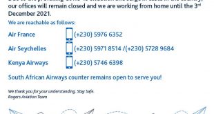 :وفق الإعلان من قبل الشركة روجرز للطيران سيتم إغلاق مكاتبنا في موريشيوس حتى ٣ ديسمبر٢٠٢١ م بسبب زيادة اصابات في موريشيوس و نحن نعمل من المنزل وسنكون سعداء لمساعدتك يمكنك الاتصال بنا على الأرقام التالية 📞 الخطوط الجوية الفرنسية (+230) 5976 6352 📞 طيران سيشل (+230) 5971 8514 الخطوط الجوية …