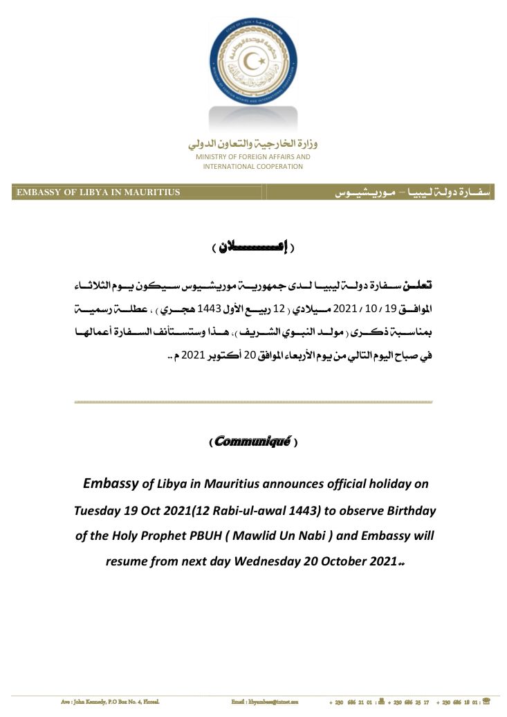 اعلان تعلن سفارة دولة ليبيا لدى جمهورية موريشيوس ستكون في عطلة رسمية بمناسبة ذكرى ( المولد النبوي الشريف ) ليوم…