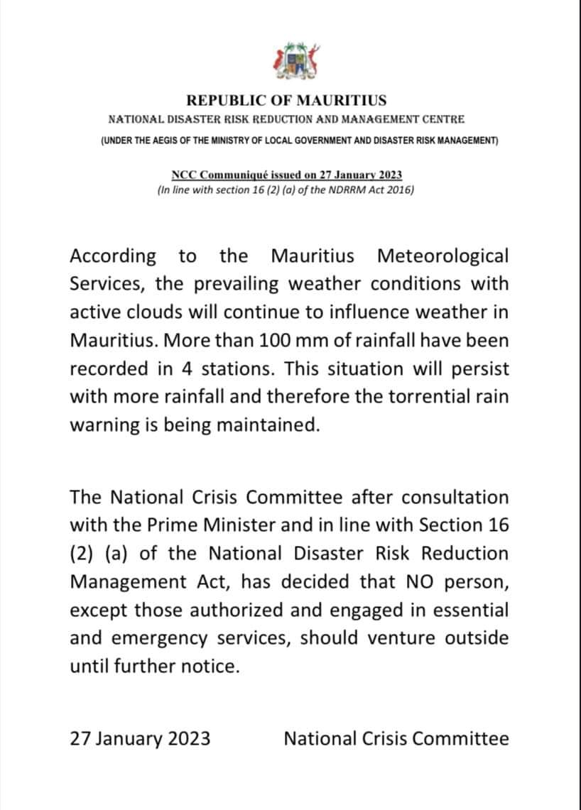 جمهورية موريشيوس المركز الوطني للحد من مخاطر الكوارث وإدارتها برعاية وزارة الحكومة المحلية وإدارة مخاطر الكوارث بيان NCC الصادر في…